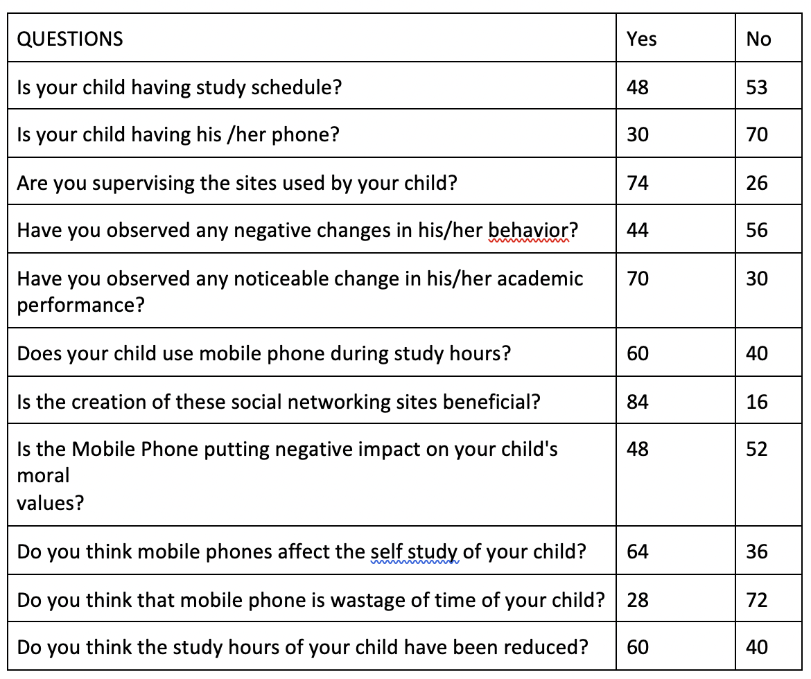 • Survey with 100 parents on the disadvantages of addiction of smartphone if it is given to students at an early age.